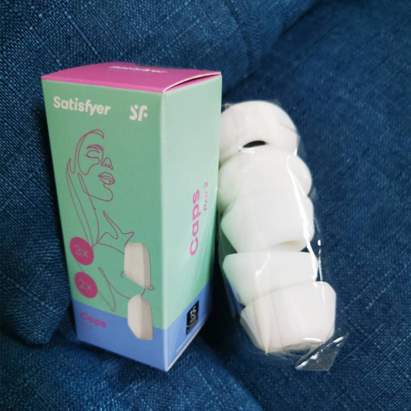 Caixa com 5 bocais(caps) substituíveis para o estimulador Satisfyer Pro 2. O conjunto inclui 2 tampas lisas e 3 volumosas feitas em silicone flexível – facilmente substituíveis com apenas 2 movimentos da mão.