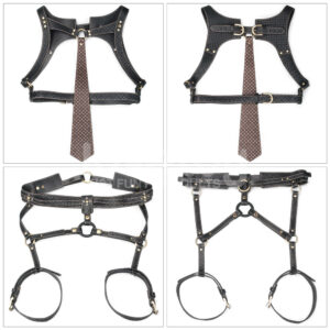 Na região do peito, o modelo conta com uma tira decorativa em couro sintético marrom, enquanto a parte pélvica apresenta um anel de silicone elástico removível, ideal para uso com cintas e consolos compatíveis, tornando o produto perfeito tanto para quem busca moda alternativa quanto para práticas mais íntimas e sensuais.