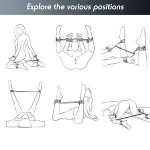 A barra é ajustável entre 57 e 86 cm, com oito furos e dois fechos metálicos resistentes, garantindo firmeza durante o uso. As algemas para punhos e tornozelos possuem ajustes independentes, oferecendo encaixe confortável para diferentes tipos de corpo. Os clipes de liberação rápida e argolas em D reforçadas permitem prender e soltar com praticidade.