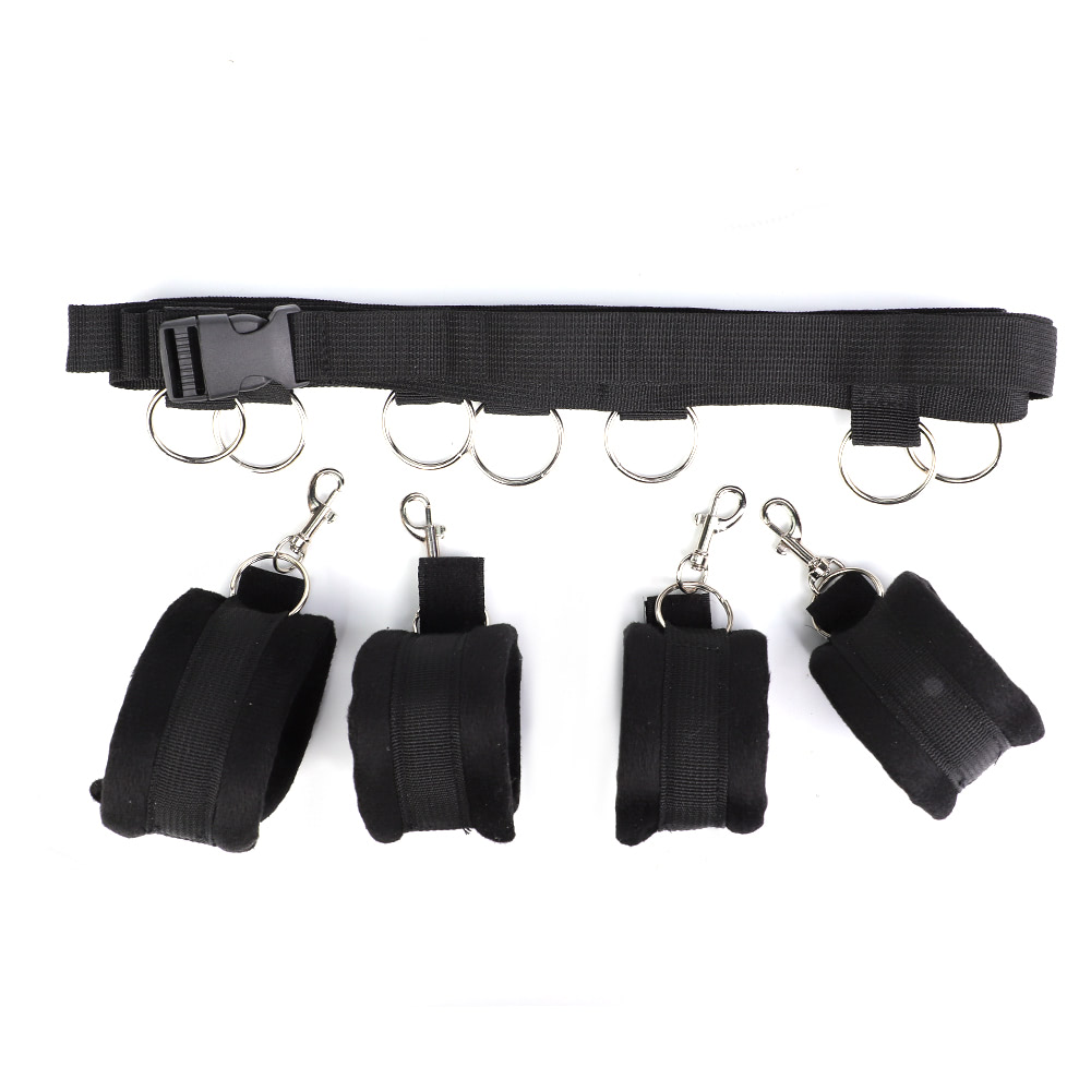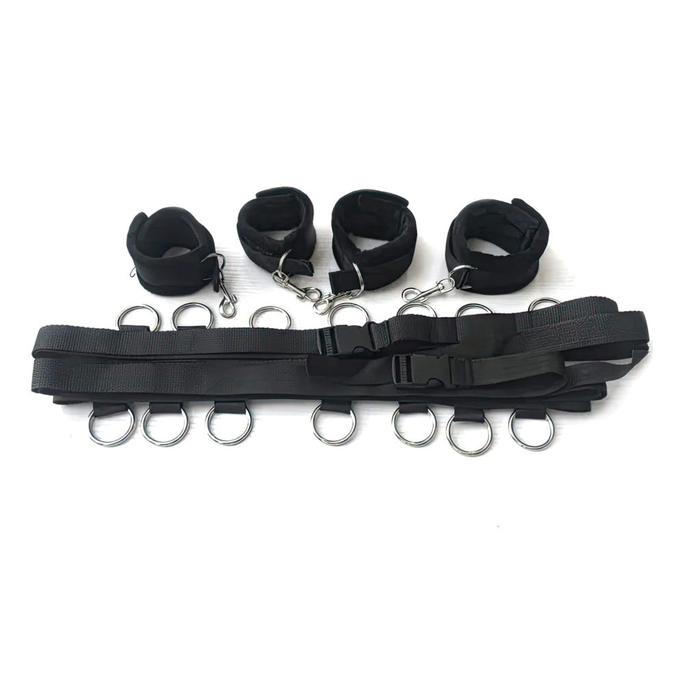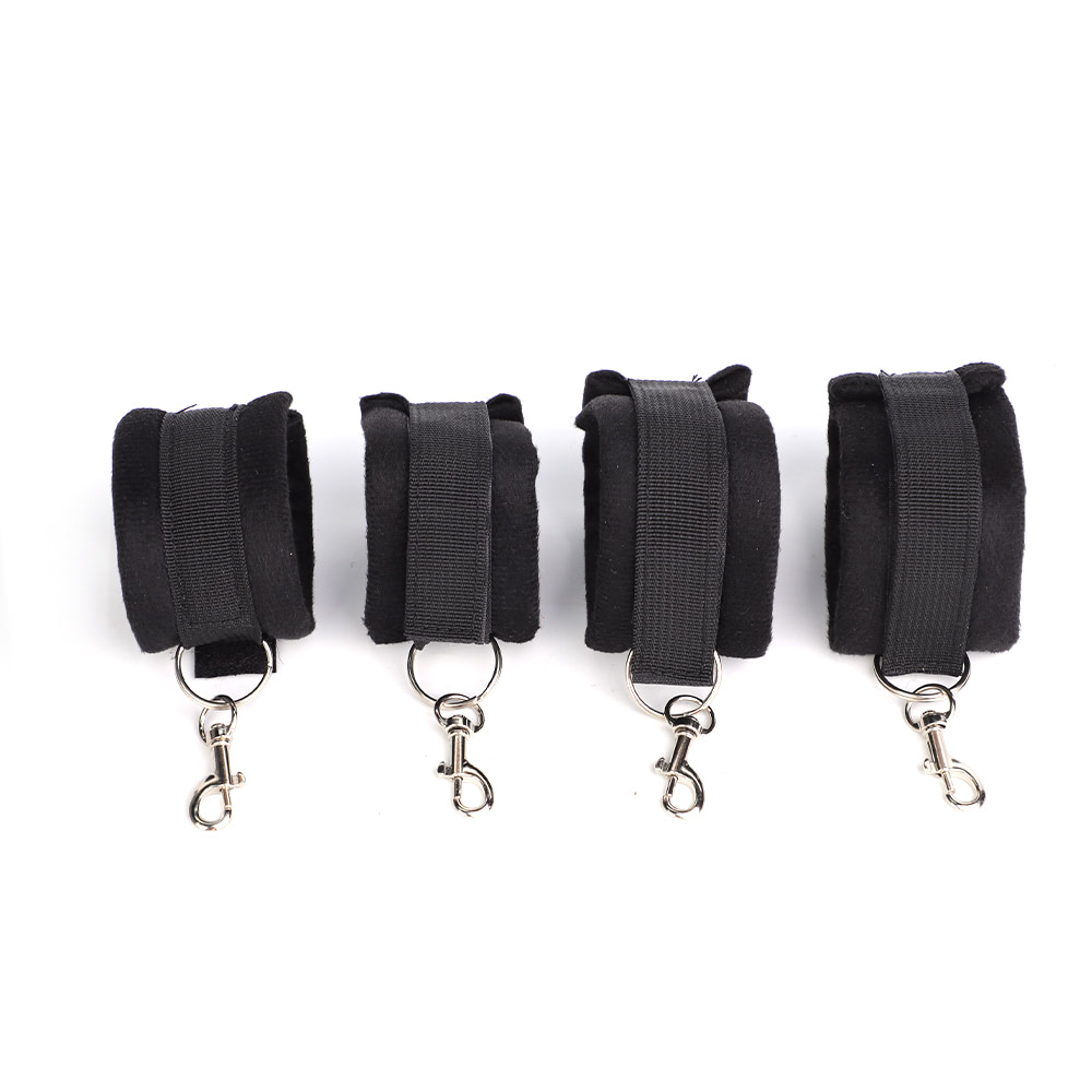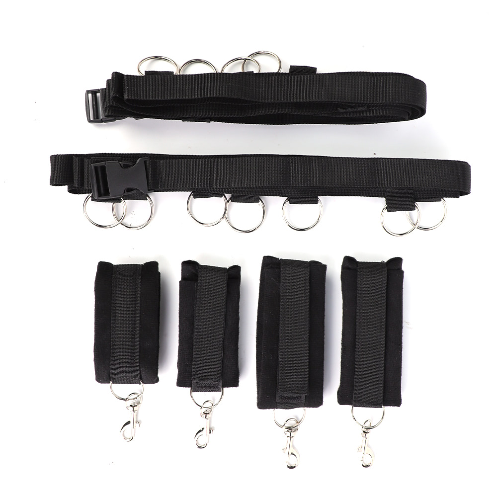 O conjunto inclui quatro algemas ajustáveis para pulsos e tornozelos, confeccionadas em material macio e resistente, com anéis metálicos que permitem diferentes conexões. Acompanha também duas tiras longas para fixação nas laterais da cama, possibilitando múltiplas posições e níveis de restrição. Para estimular ainda mais os sentidos, o kit conta com uma fita de cetim e uma pluma, ideais para jogos de provocação e sensorialidade.