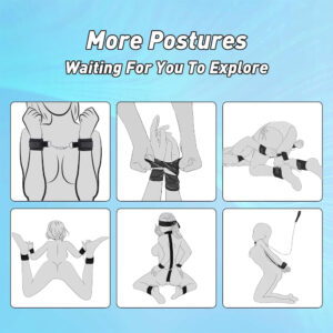 A coleira possui três argolas metálicas em formato “D”, possibilitando fixações em diferentes ângulos. As algemas para mãos e pés são removíveis, permitindo montagem personalizada conforme a brincadeira. O conjunto inclui também fitas para amarrar os pulsos e uma venda para privação de visão.