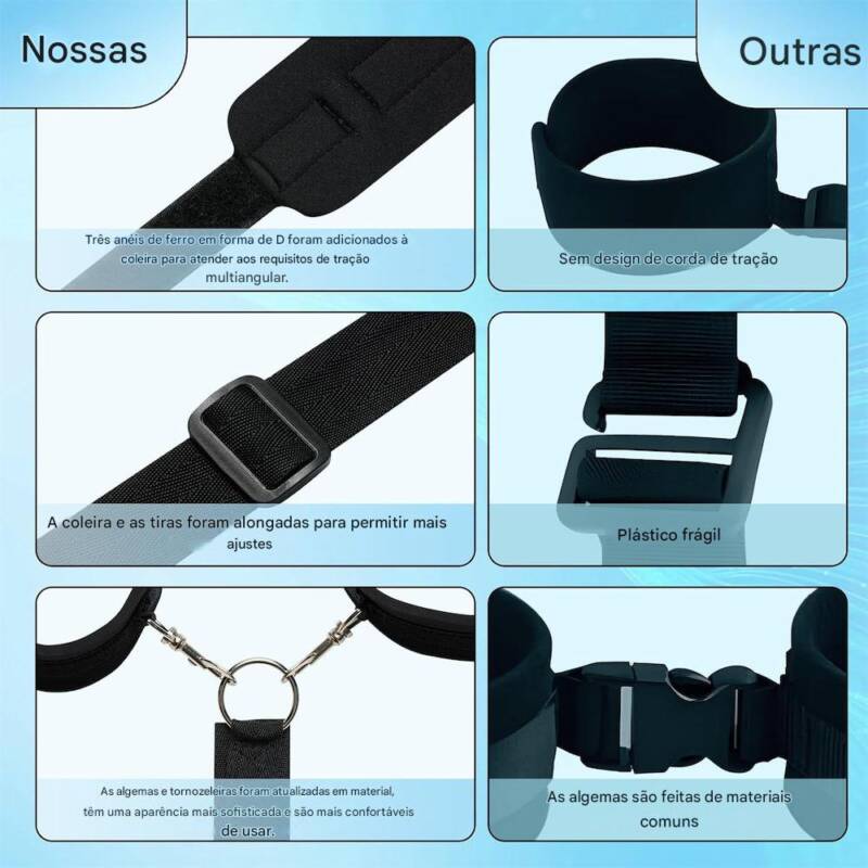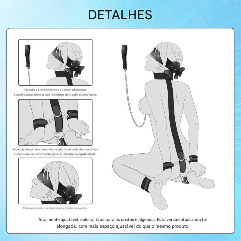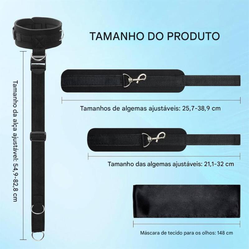 A coleira possui três argolas metálicas em formato “D”, possibilitando fixações em diferentes ângulos. As algemas para mãos e pés são removíveis, permitindo montagem personalizada conforme a brincadeira. O conjunto inclui também fitas para amarrar os pulsos e uma venda para privação de visão.