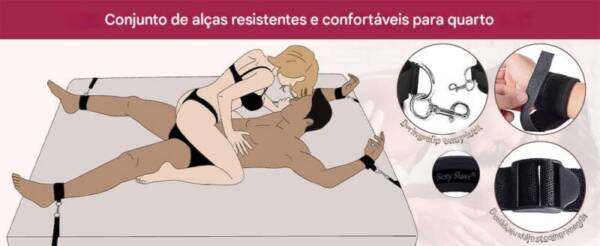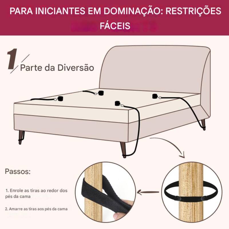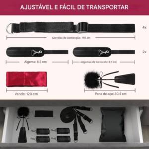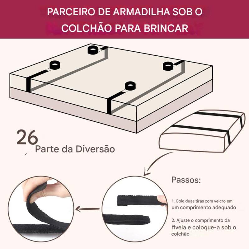 O coração do kit é o sistema de cintas ajustáveis que se fixa sob o colchão, permanecendo invisível por fora, mas oferecendo pontos de ancoragem robustos em cada extremidade. A grande vantagem deste conjunto é a liberdade de configuração: as algemas de pulsos e tornozelos podem ser posicionadas para manter o parceiro(a) com braços e pernas abertos, presos juntos ou em dezenas de outras variações. Essa flexibilidade permite adaptar as amarras para diversas posições, garantindo que cada sessão seja única e personalizada.