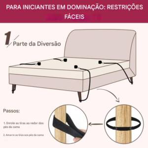 A instalação é simples e rápida: posicione as cintas principais em formato de “X” ou em paralelo sob o colchão. Puxe as extremidades para fora nas laterais da cama e ajuste os comprimentos desejados. Prenda as algemas nos pulsos e tornozelos utilizando os mosquetões de metal. Por ser um sistema de engate rápido, as restrições podem ser liberadas facilmente, garantindo segurança total para iniciantes e praticantes experientes.