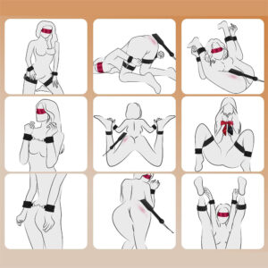 As algemas conectam pulsos e coxas, permitindo imobilização estável e adequada para posições como “cachorrinho”, pernas elevadas ou abertura total, intensificando a entrega e o prazer durante a brincadeira. Os acessórios incluídos permitem variação de sensações, desde a privação de visão até estímulos com a palmatória.