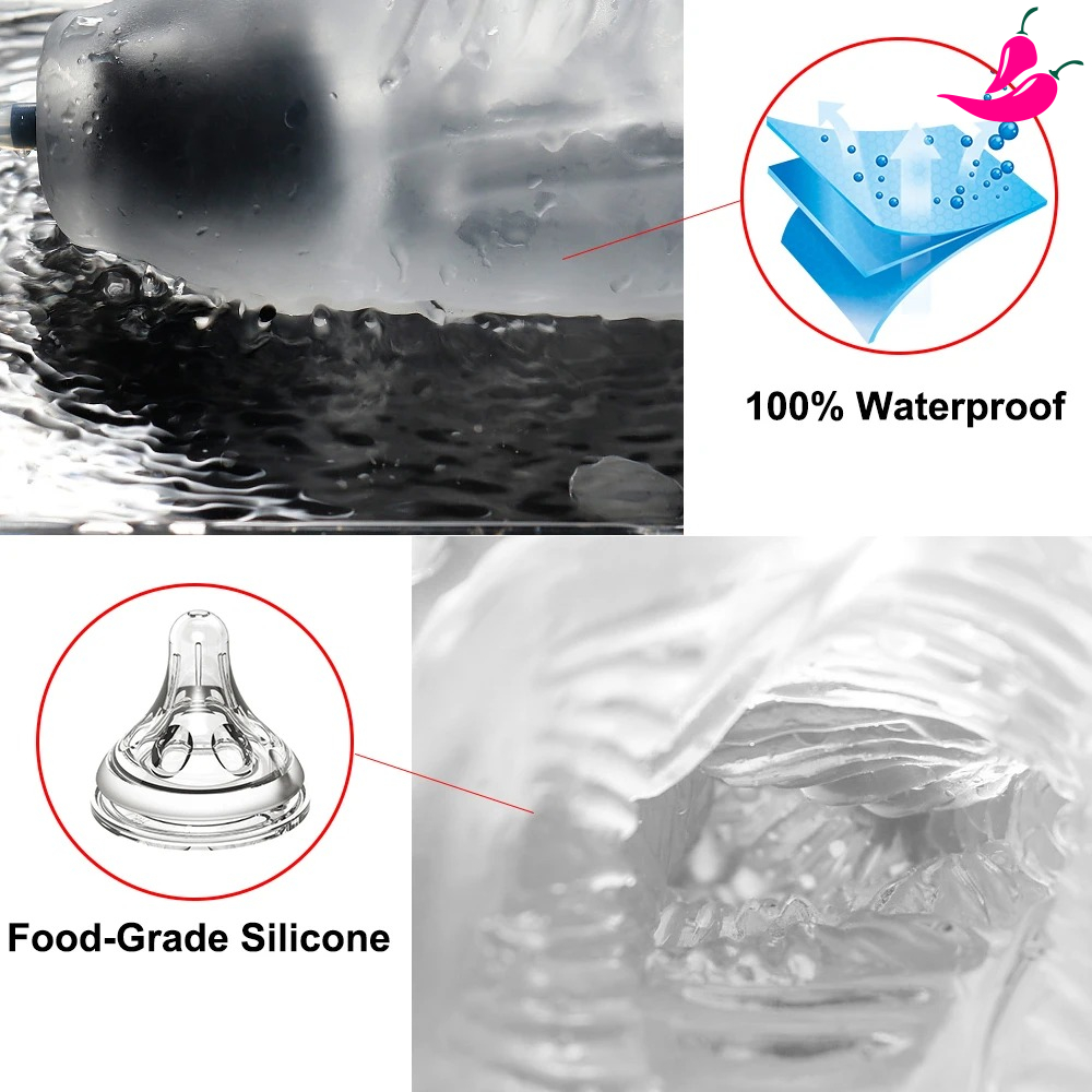 6. Feito de silicone de platina de alta qualidade, seguro para o corpo, não poroso e livre de ftalatos Limpeza fácil: o tubo de sucção tem uma câmara líquida circular ao longo do tubo que captura sua ejaculação e a impede de alcançar o motor.