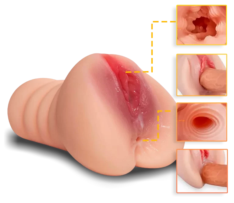 Design vaginal com exterior realístico, acompanhado de uma combinação de múltiplos relevos, ranhuras e dobras internas,