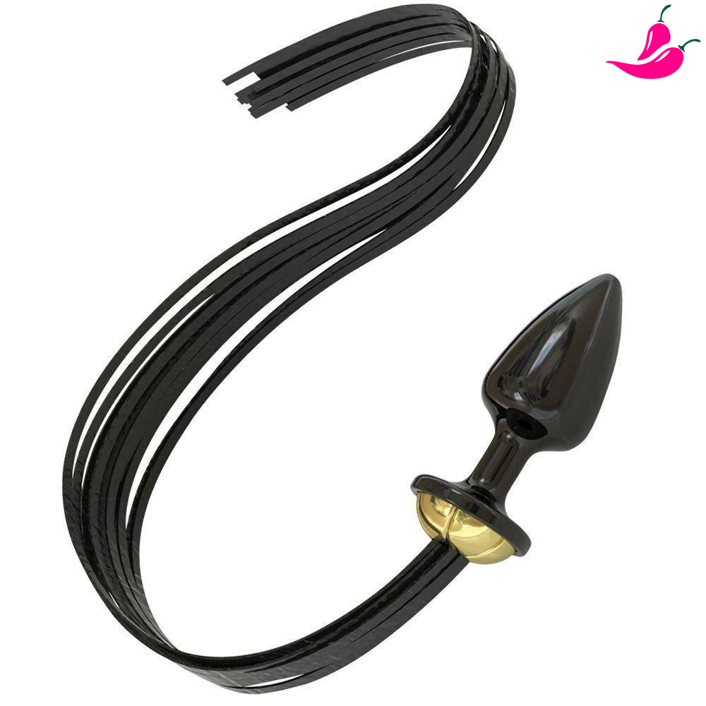 Plug anal fabricado em metal, com superfície lisa e chicote acoplado fabricado em couro sintético. Perfeito para incitar a curiosidade no parceiro e começar uma brincadeira sado com elegância. É perfeito para todos os tipos de corpo. Excitante demais!