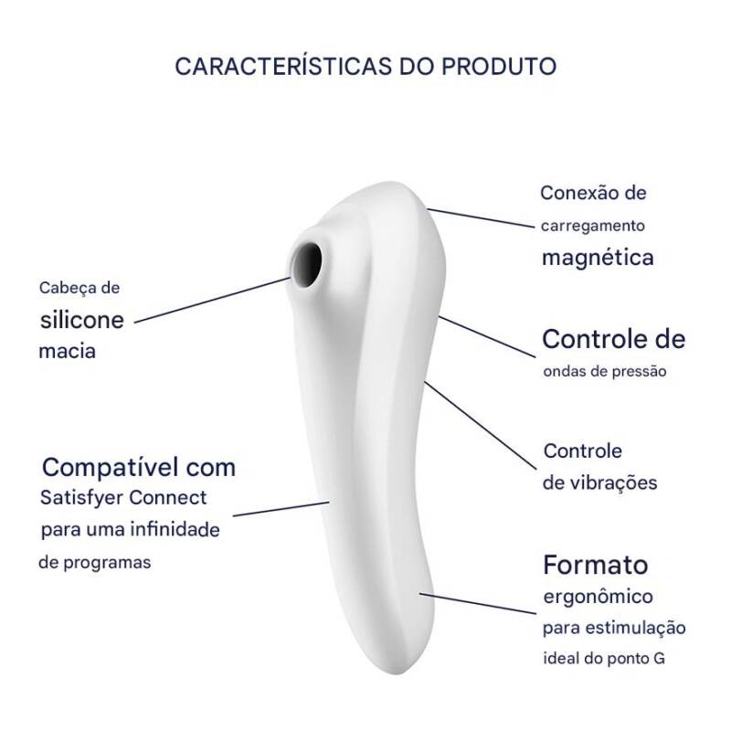 O Satisfyer Dual Pleasure é feito de silicone seguro para o corpo e proporciona estimulação tanto do clitóris quanto do ponto G. Este brinquedo combina ondas de pressão pulsantes com uma haste vibratória ergonômica e pode ser facilmente controlado através da app gratuita Satisfyer Connect, disponível para iOS e Android.
