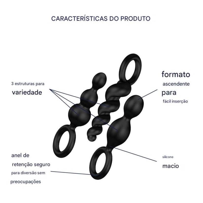 Com 3 estruturas diferentes, o Booty Call Set da Satisfyer é ideal para principiantes no treino anal. Os plugs anais oferecem um diâmetro crescente, para que o ânus seja suavemente esticado e, assim, possa abrir caminho com toda a prudência. É difícil superar os plugs em termos de versatilidade: pode-se escolher entre o design torcido em espiral, a forma cónica estreita e a estrutura esférica clássica com 3 elementos. Os 3 designs impressionam pela sua superfície lisa e flexível em silicone macio, higiénico e seguro para o corpo. A alça muito prática simplifica a inserção deste acessório anal e garante uma utilização sem complicações. Além disso, o anel funciona como uma base larga que impede a inserção completa dos plugs anais, para que você possa dedicar ao treino anal sem preocupações.