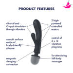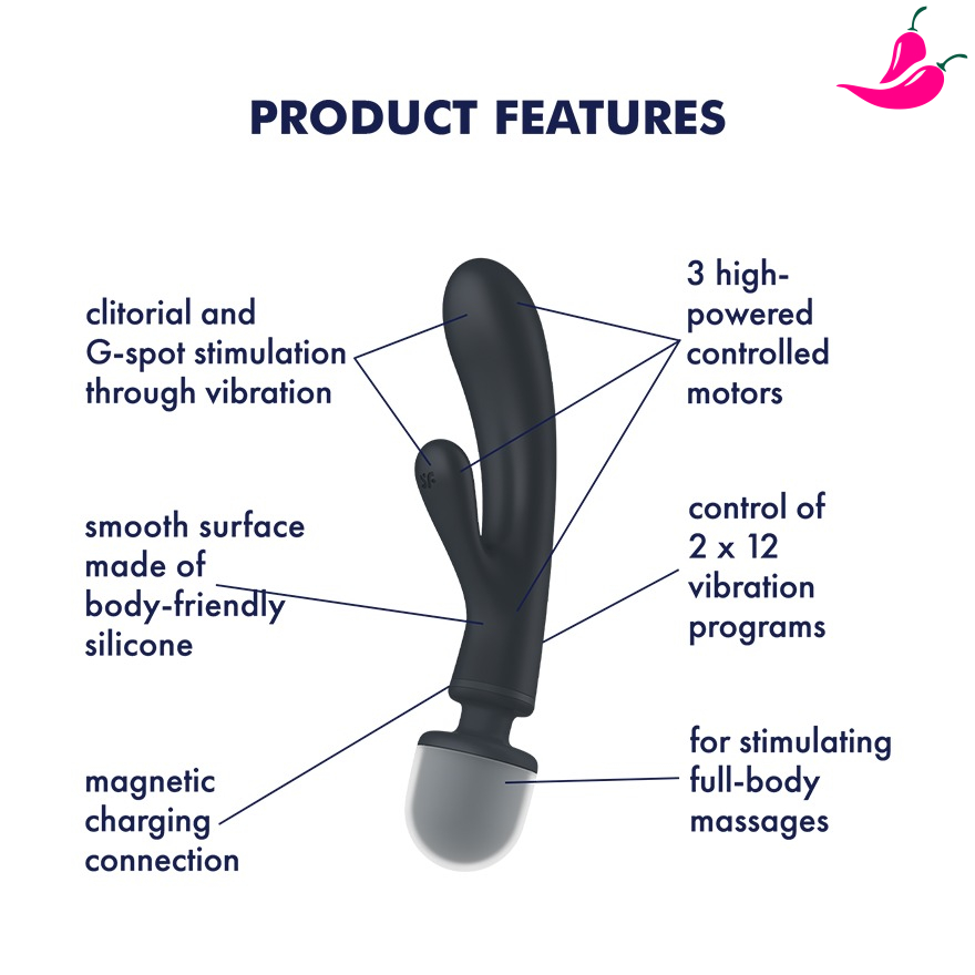 Os 3 motores fornecem as duas funções do Satisfyer Triple Lover feito de silicone, que possui bastante potência. O vibrador pode ser usado como um Rabbit para estimulação síncrona do ponto G e do clitóris, ou como um massajador para massagens em todo o corpo.