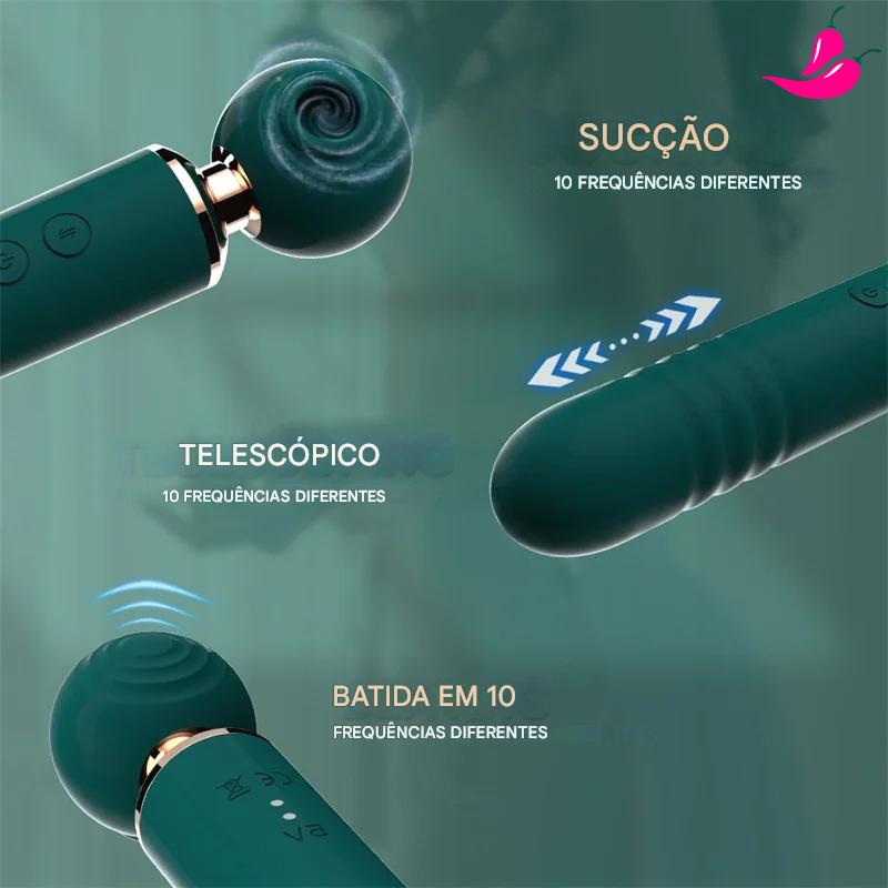 O Vibrador Varinha Mágica possui 3 funções em apenas um vibrador, 10 modos de vibrações , 10 modos de sucção e 10 modos de pulsação, totalmente completo permitindo que voce possa estimular diversas partes do corpo ao mesmo tempo.